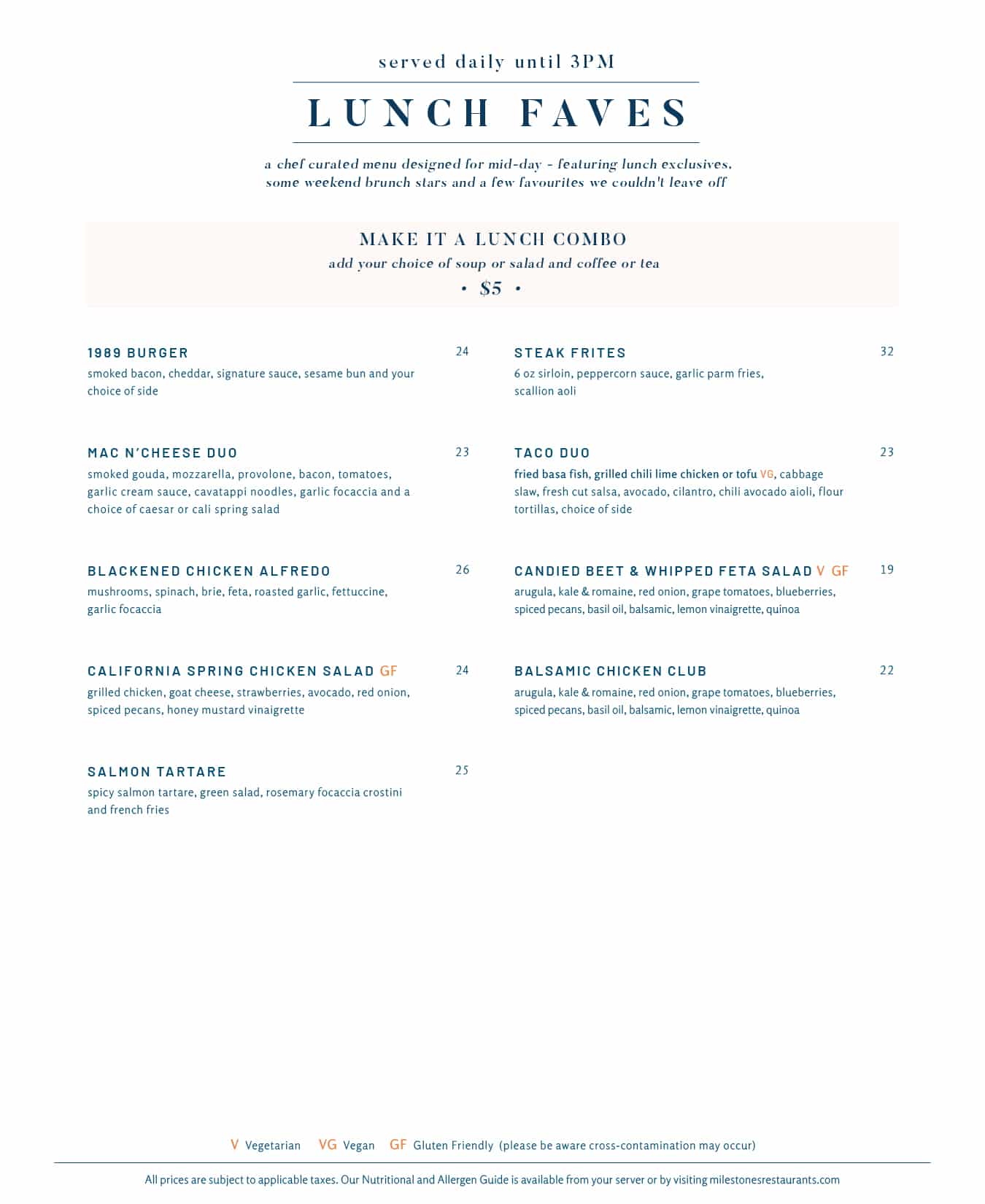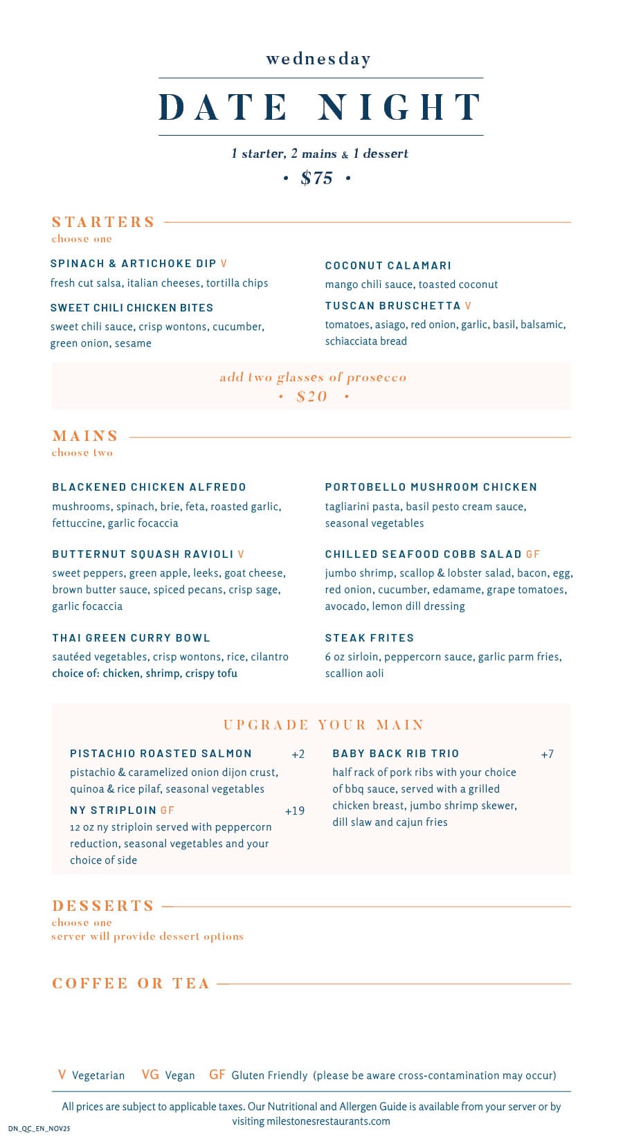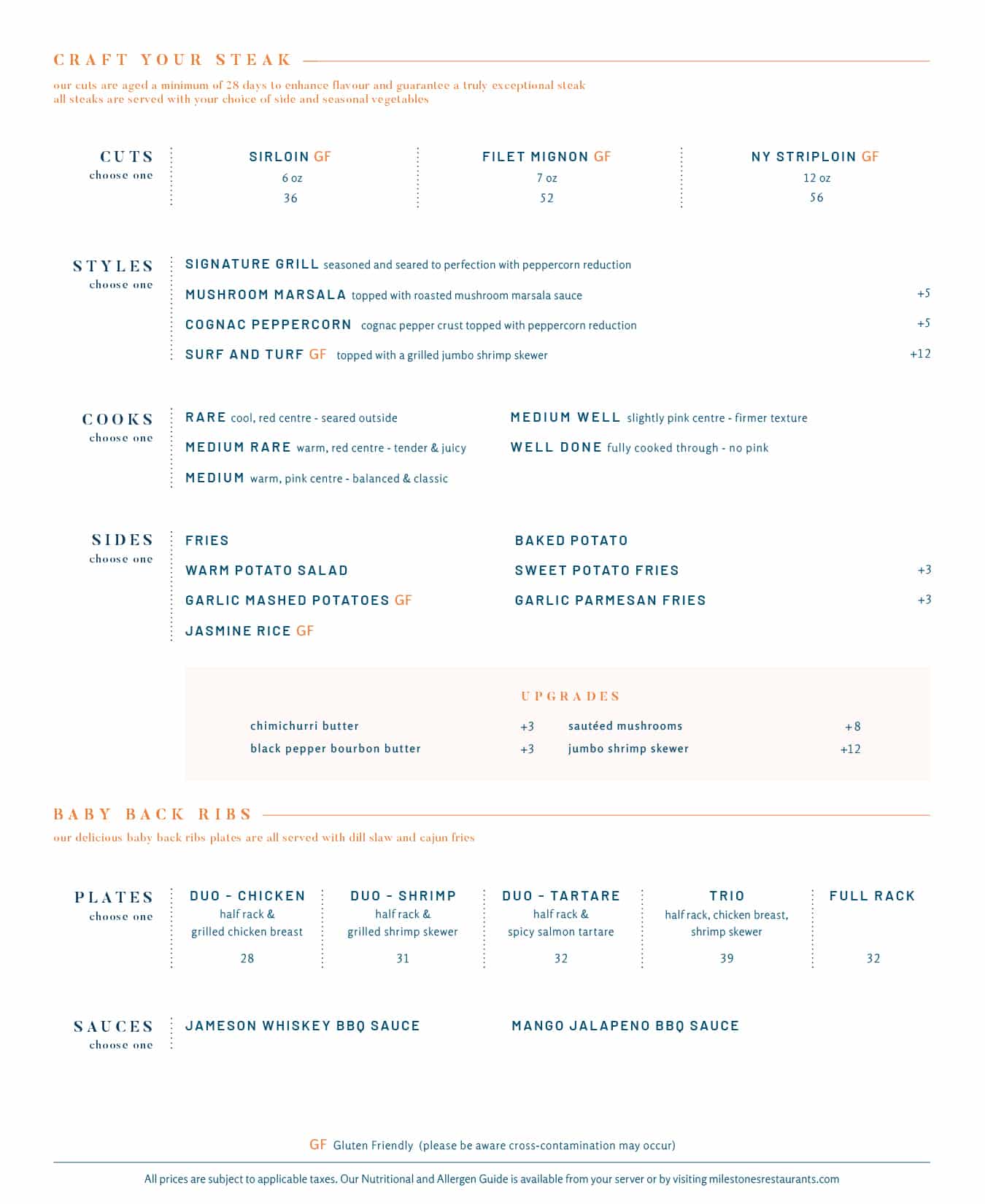 All applicable taxes extra. Gluten Friendly items are made with gluten-free ingredients, however, please be advised that cross contamination with gluten containing products may occur in our kitchen during preparation. Please ask your server for details. Some items may contain nuts and/or allergens. Food Allergy Caution – the safety and satisfaction of our Guests is our highest priority. Although precaution is taken to manage the risk of allergen cross contamination in our kitchen, please be advised that there is a possibility of cross contamination occurring during preparation. Therefore, we cannot guarantee that a menu item is free of peanuts, tree nuts and | or other allergens.