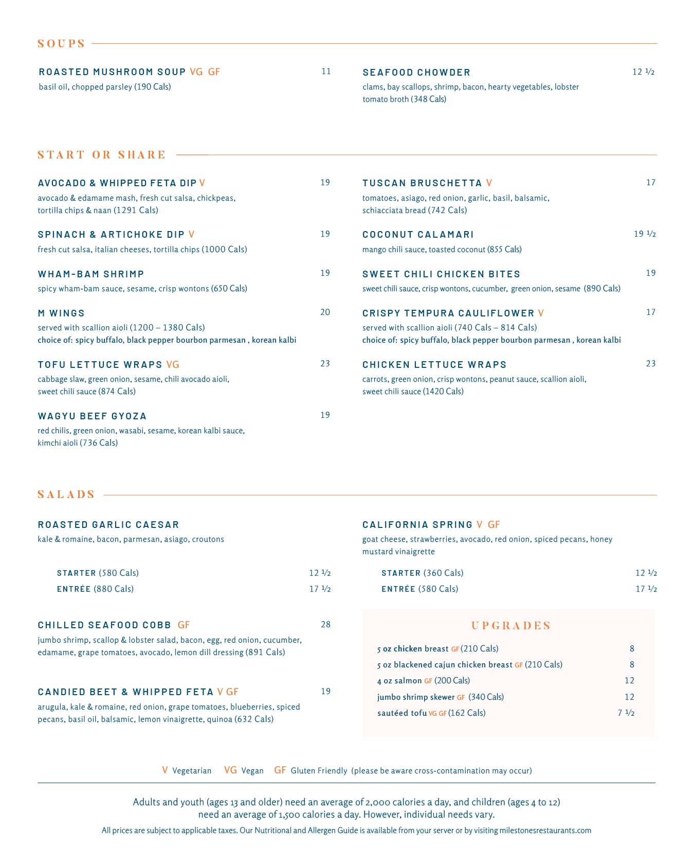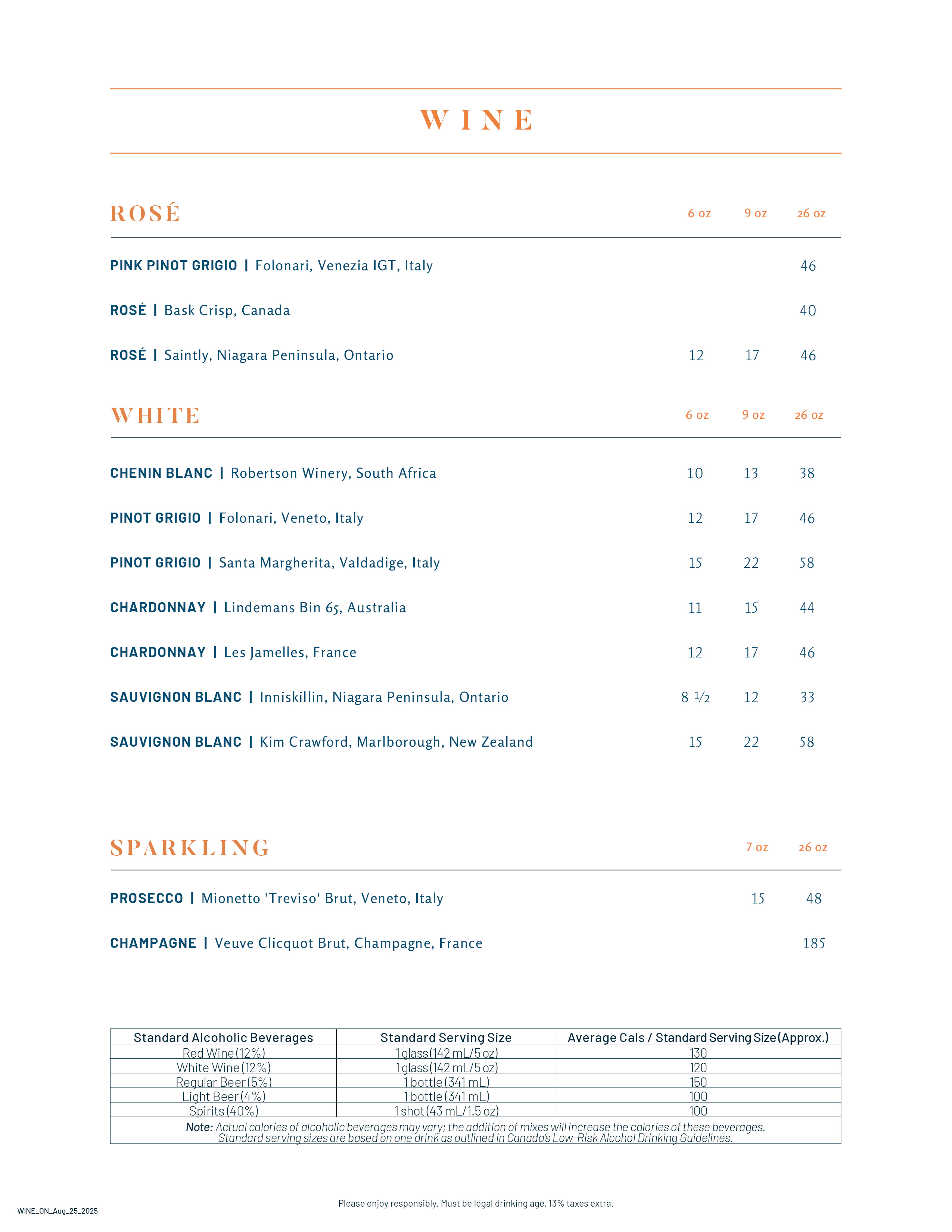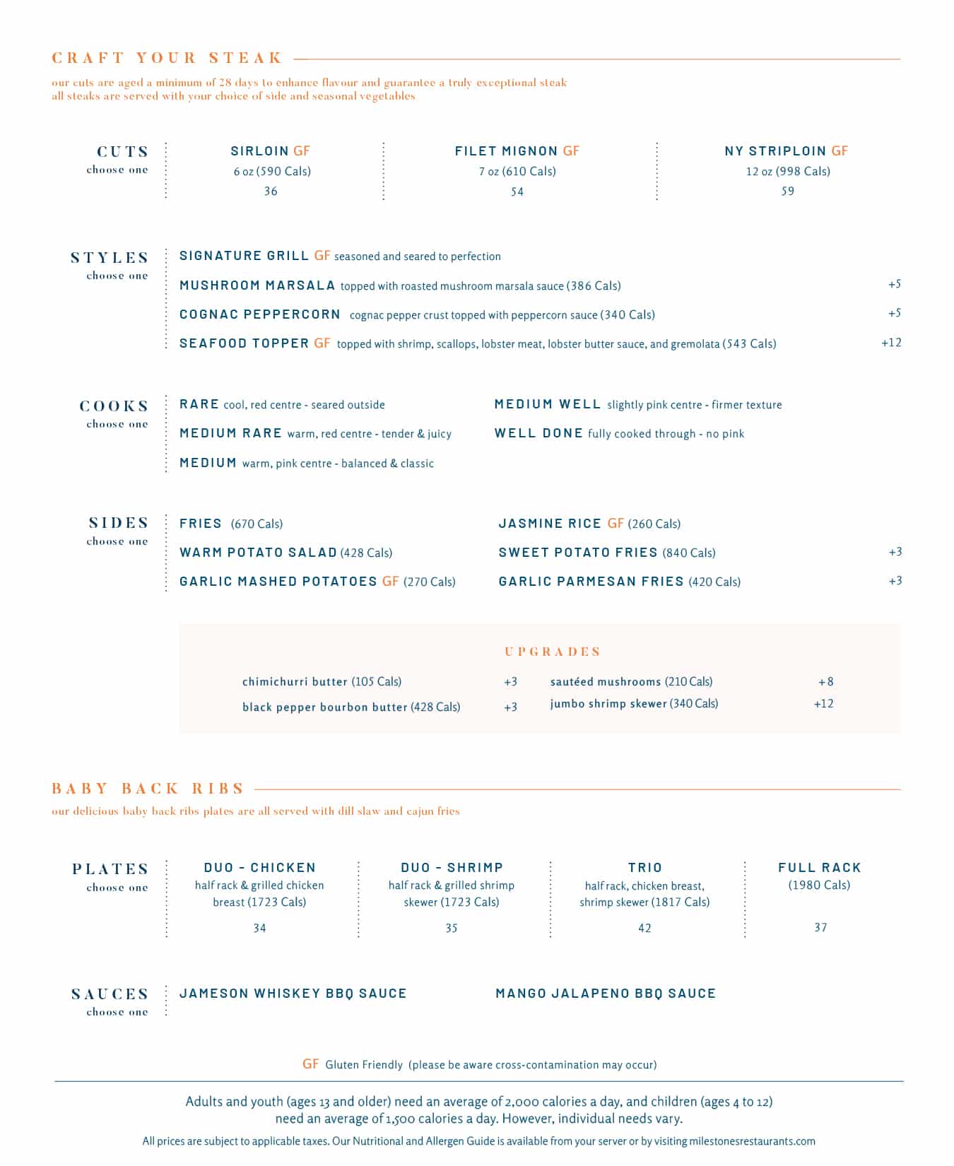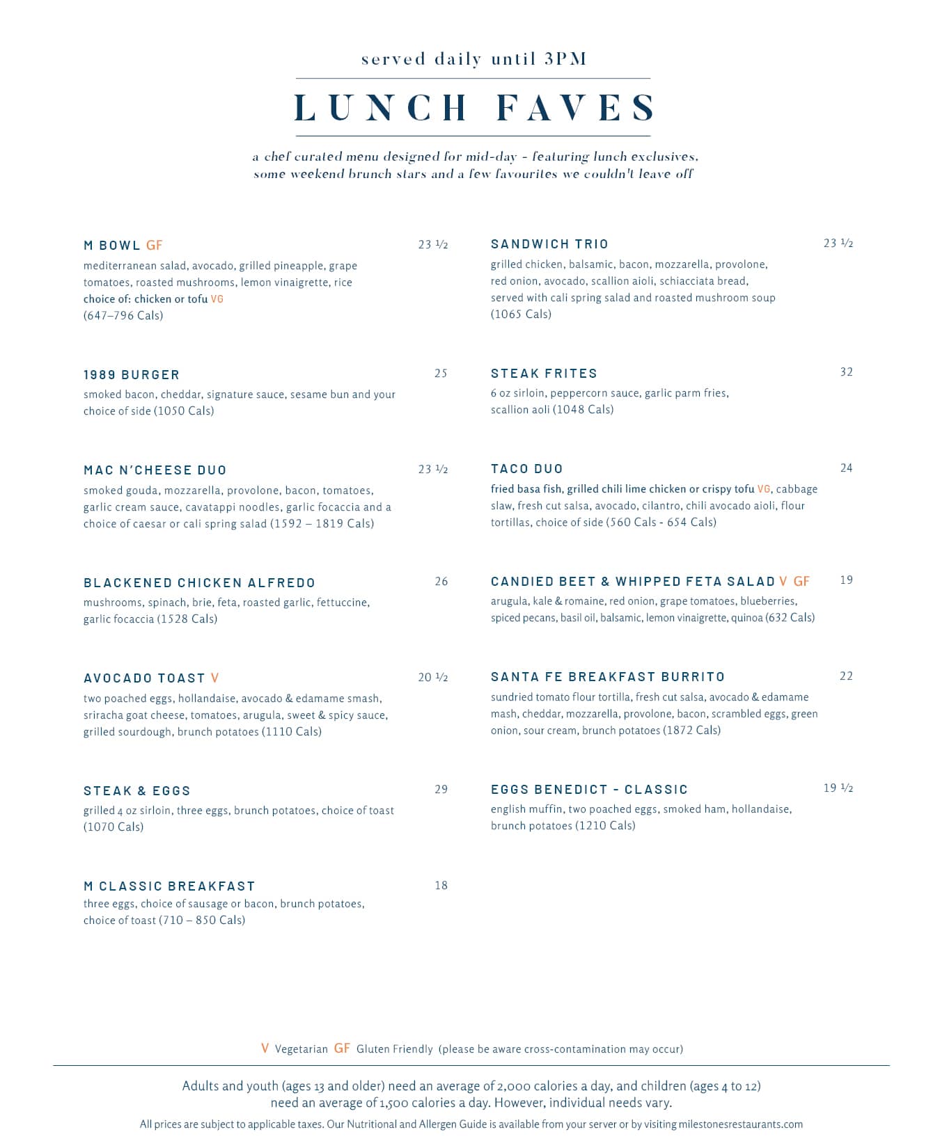 All applicable taxes extra. Gluten Friendly items are made with gluten-free ingredients, however, please be advised that cross contamination with gluten containing products may occur in our kitchen during preparation. Please ask your server for details. Some items may contain nuts and/or allergens. Food Allergy Caution – the safety and satisfaction of our Guests is our highest priority. Although precaution is taken to manage the risk of allergen cross contamination in our kitchen, please be advised that there is a possibility of cross contamination occurring during preparation. Therefore, we cannot guarantee that a menu item is free of peanuts, tree nuts and | or other allergens.