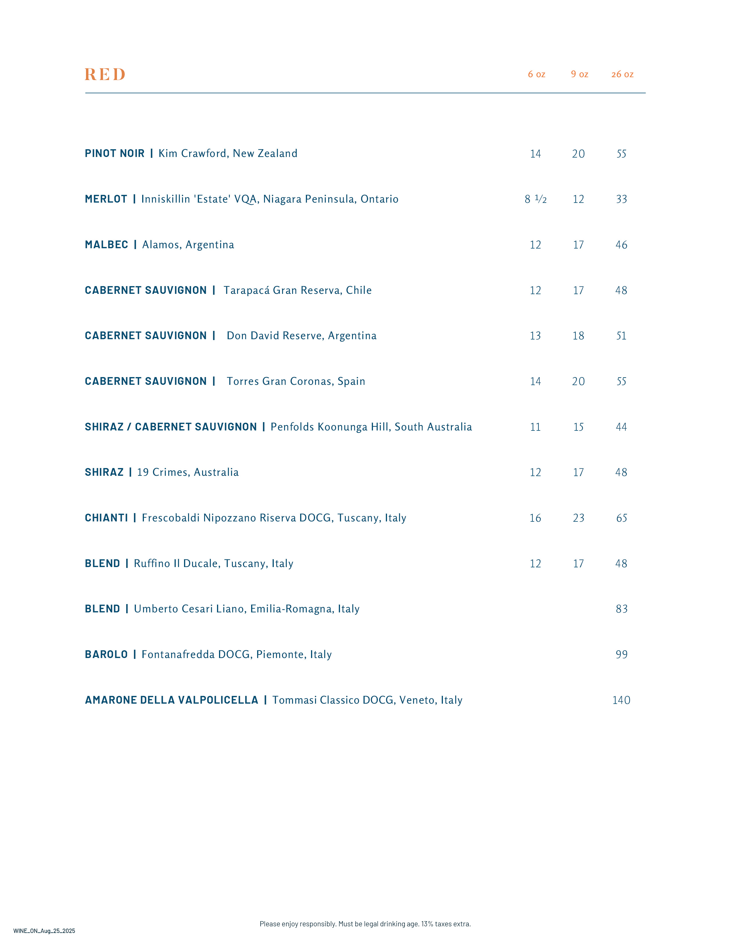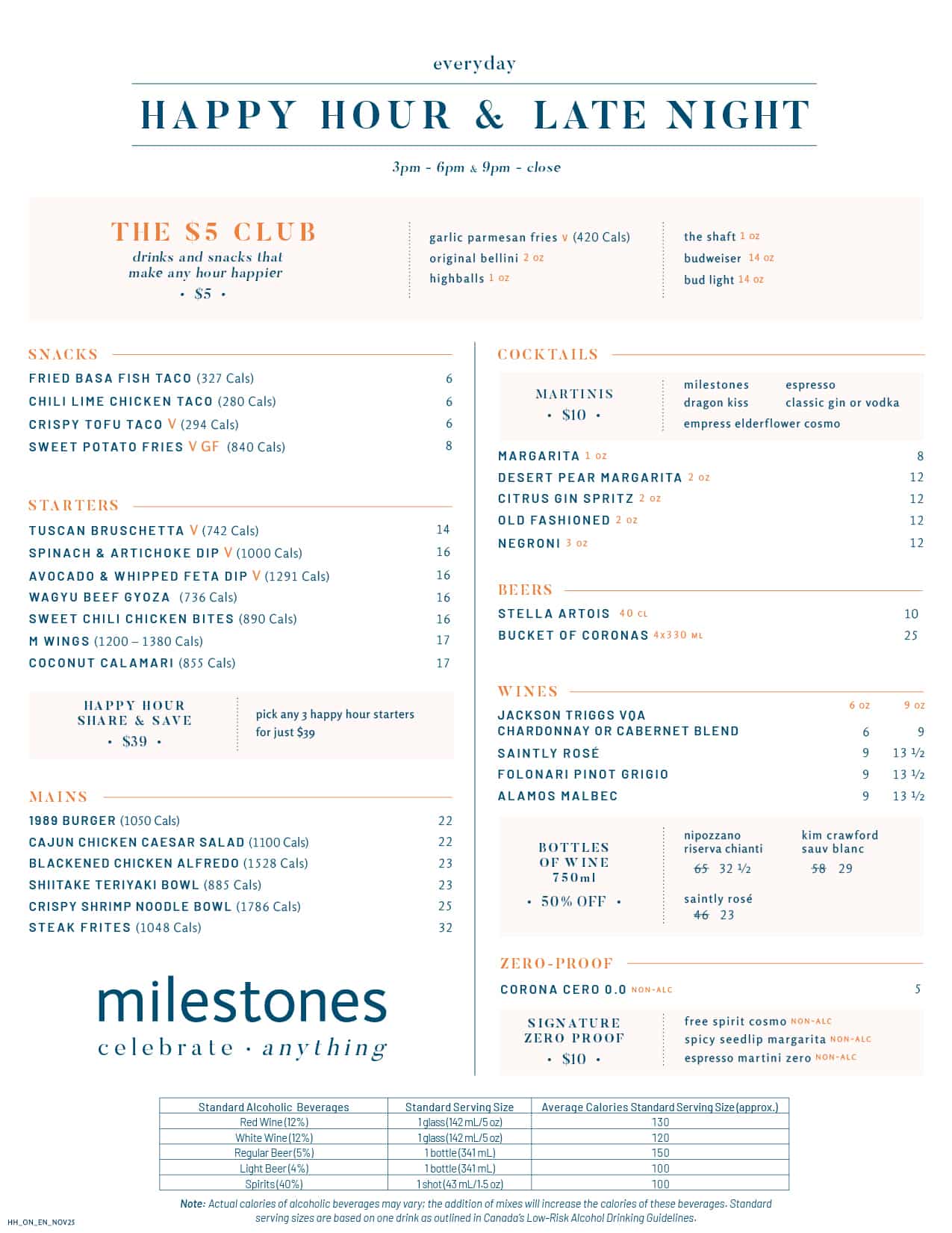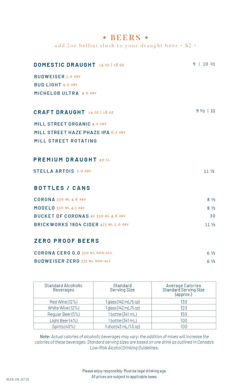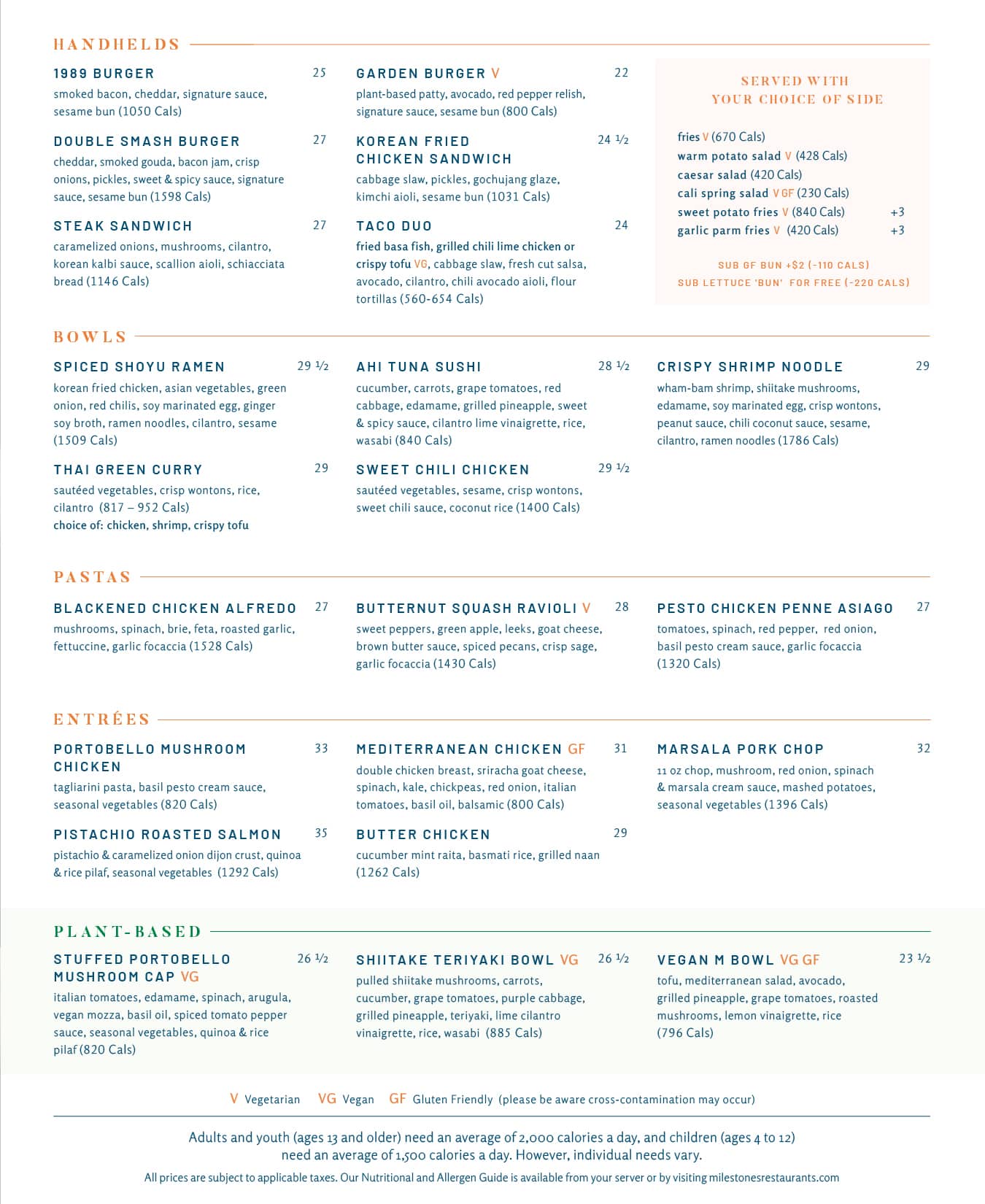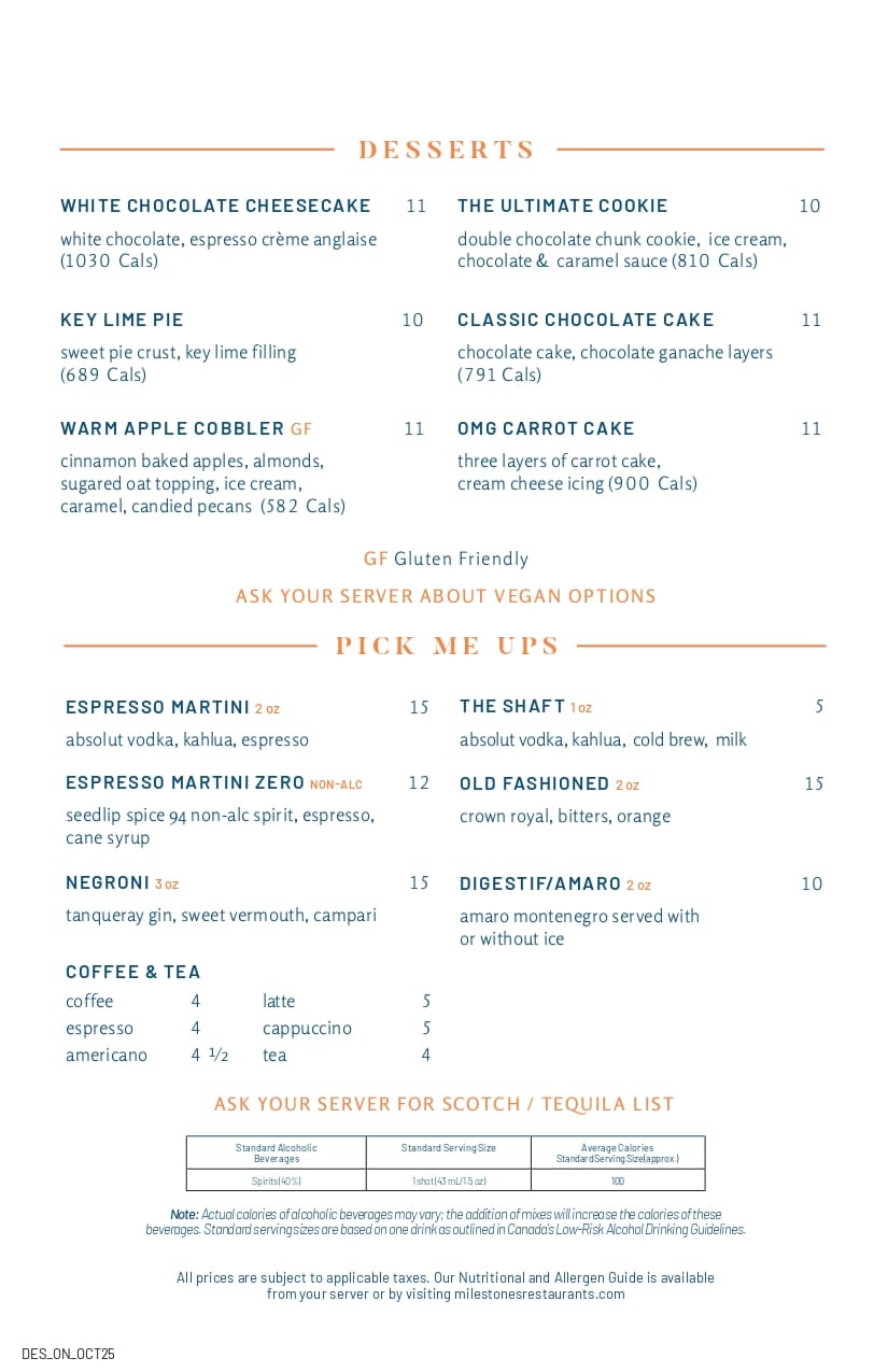 All applicable taxes extra. Gluten Friendly items are made with gluten-free ingredients, however, please be advised that cross contamination with gluten containing products may occur in our kitchen during preparation. Please ask your server for details. Some items may contain nuts and/or allergens. Food Allergy Caution – the safety and satisfaction of our Guests is our highest priority. Although precaution is taken to manage the risk of allergen cross contamination in our kitchen, please be advised that there is a possibility of cross contamination occurring during preparation. Therefore, we cannot guarantee that a menu item is free of peanuts, tree nuts and | or other allergens.