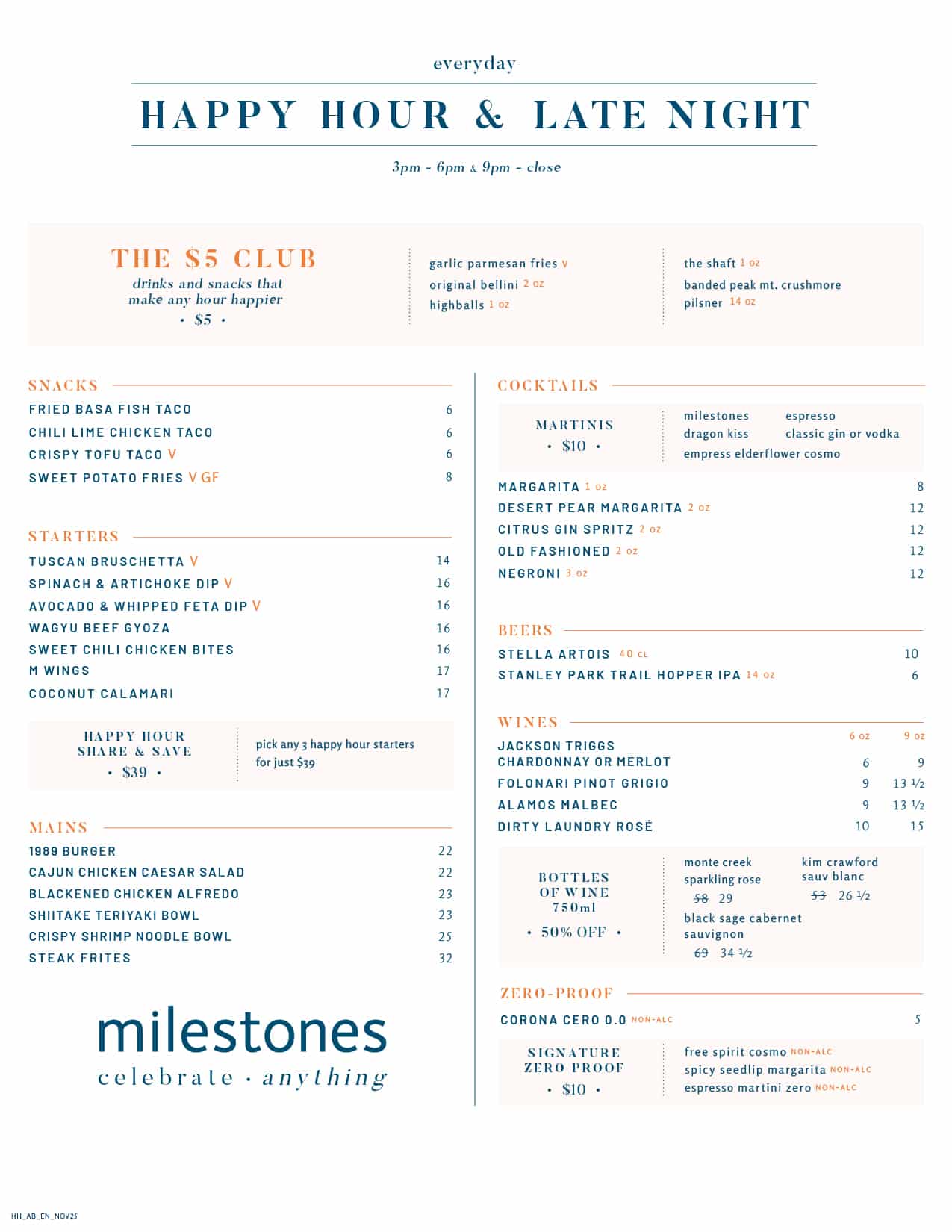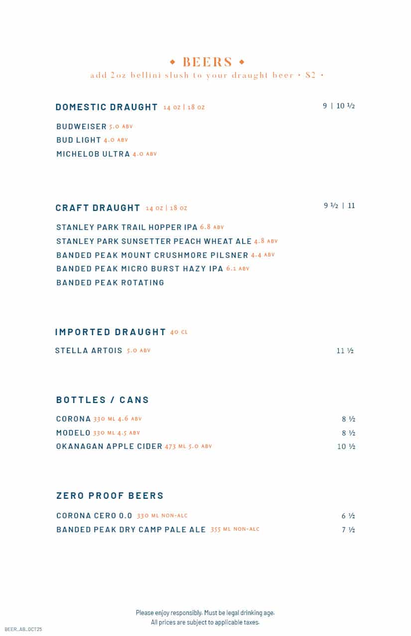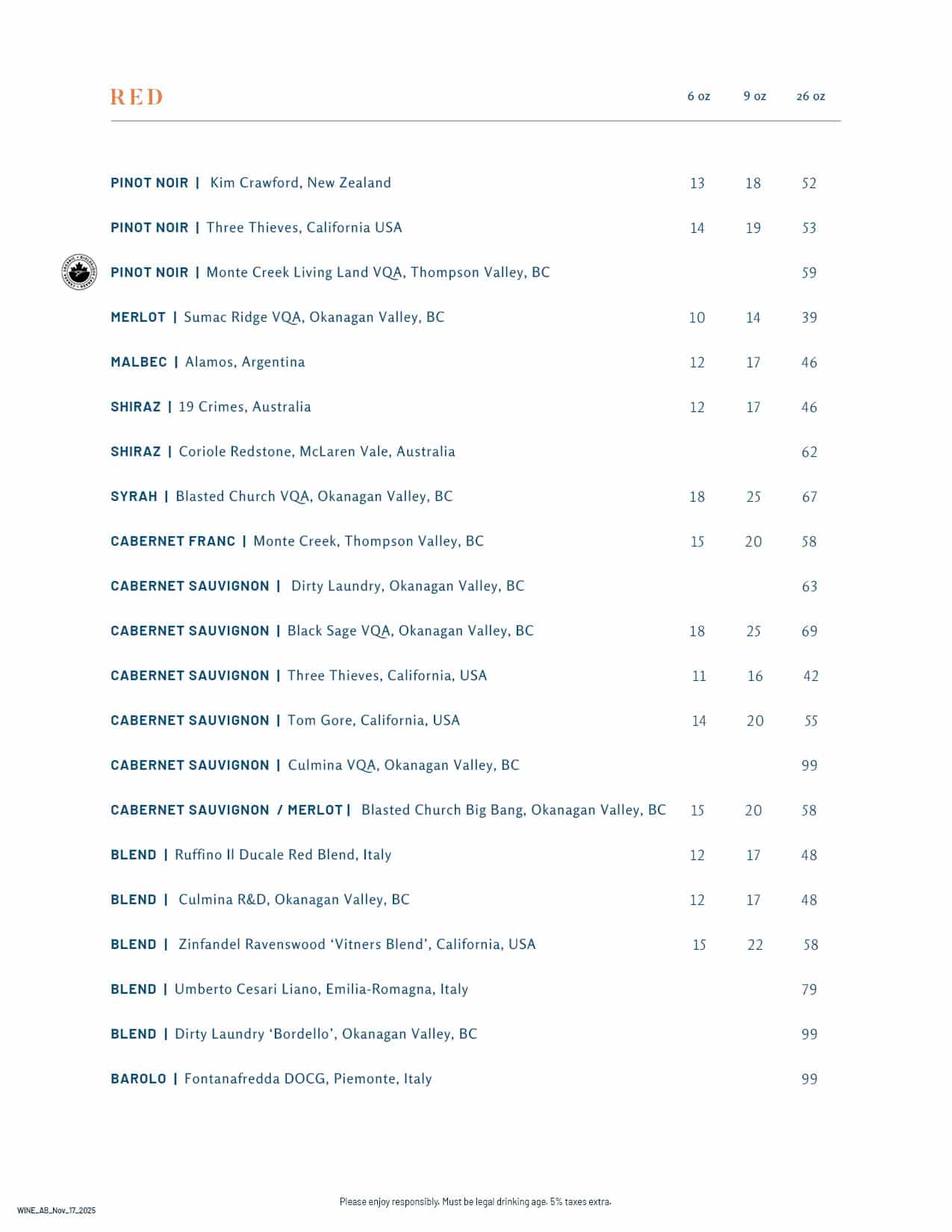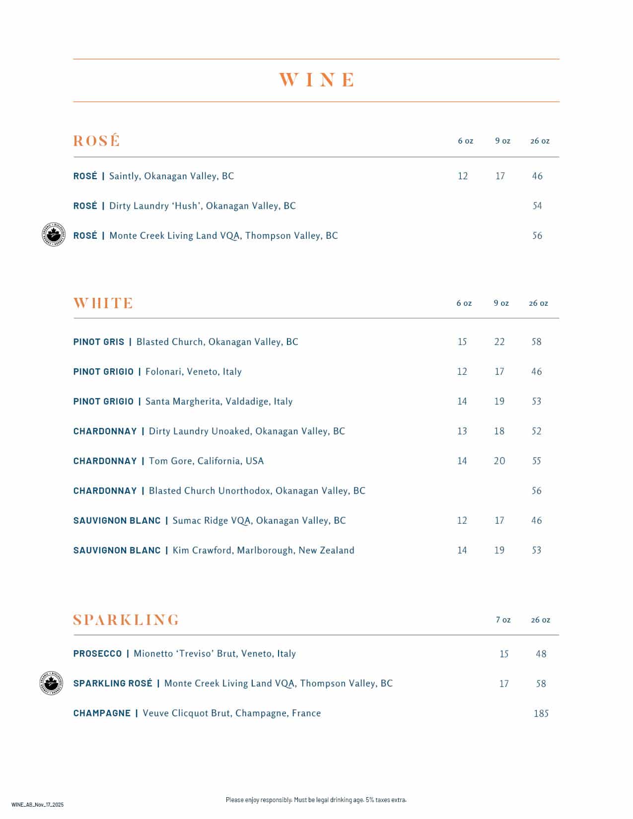 All applicable taxes extra. Gluten Friendly items are made with gluten-free ingredients, however, please be advised that cross contamination with gluten containing products may occur in our kitchen during preparation. Please ask your server for details. Some items may contain nuts and/or allergens. Food Allergy Caution – the safety and satisfaction of our Guests is our highest priority. Although precaution is taken to manage the risk of allergen cross contamination in our kitchen, please be advised that there is a possibility of cross contamination occurring during preparation. Therefore, we cannot guarantee that a menu item is free of peanuts, tree nuts and | or other allergens.