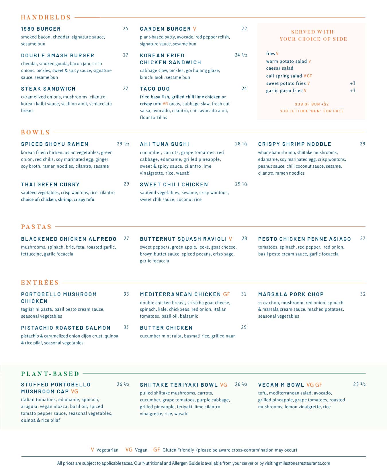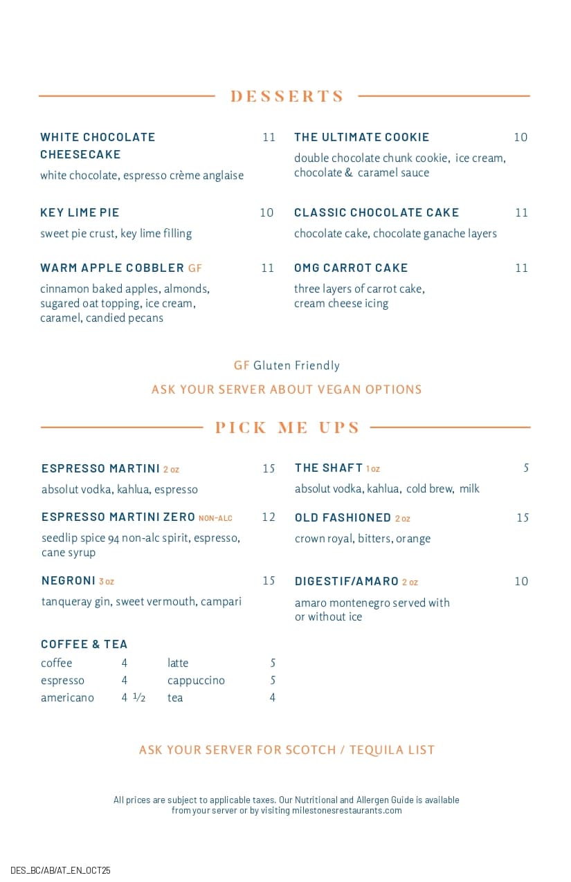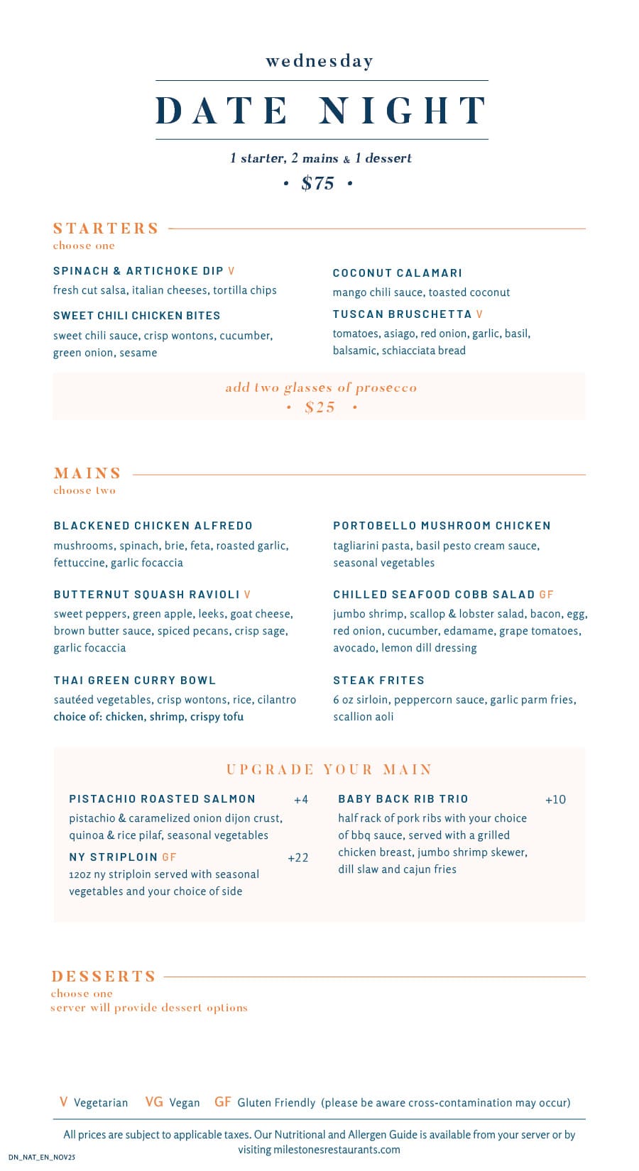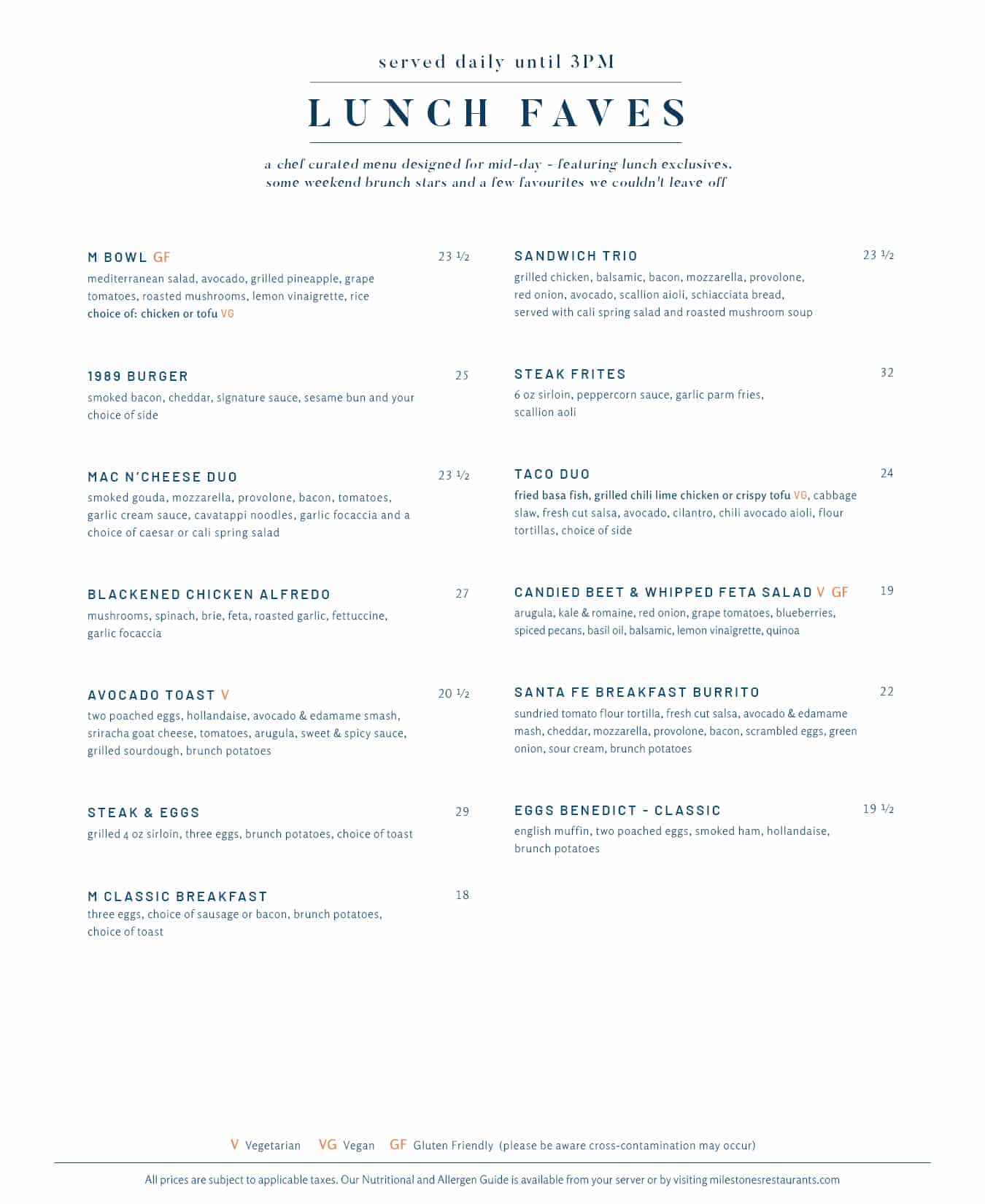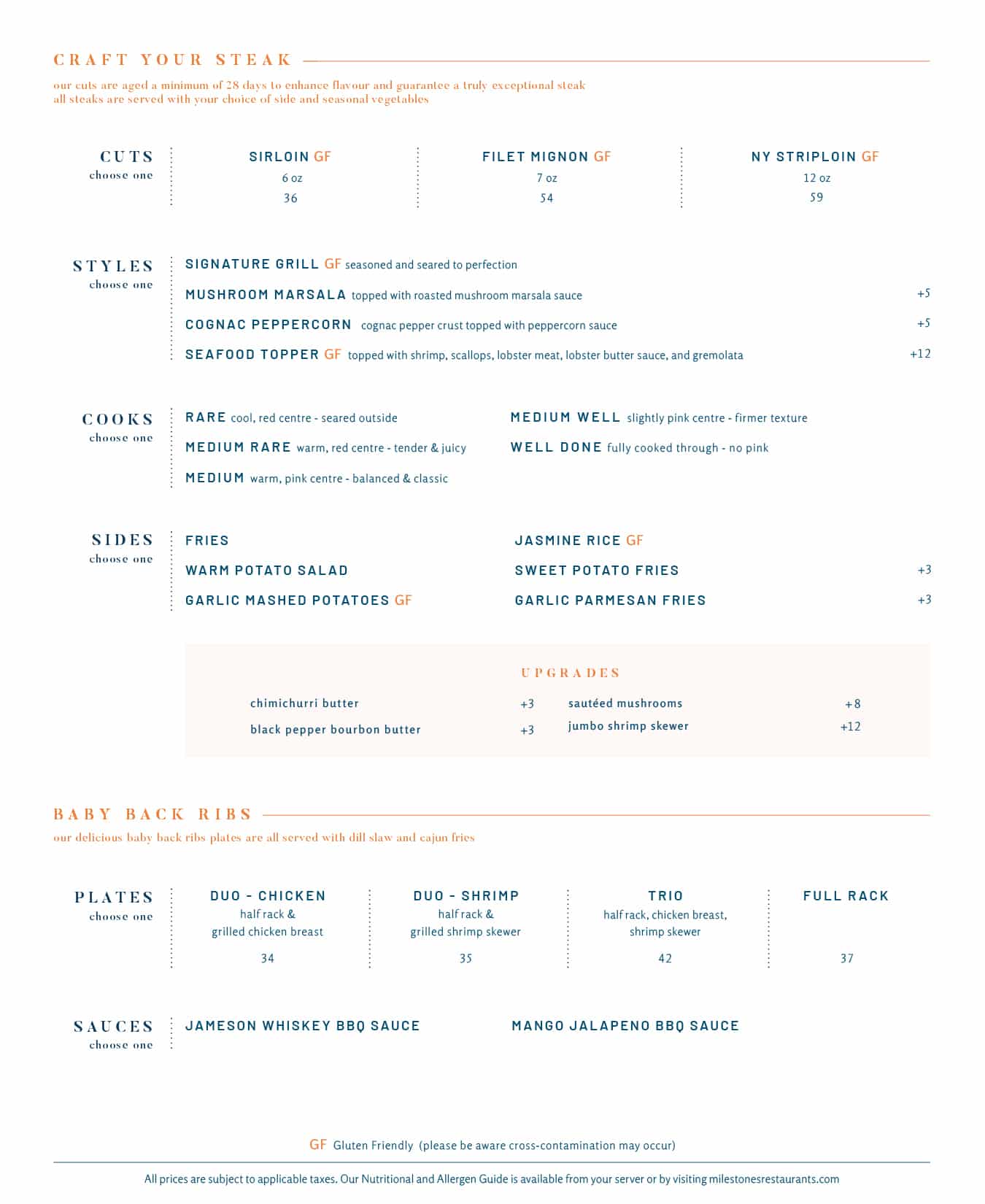 All applicable taxes extra. Gluten Friendly items are made with gluten-free ingredients, however, please be advised that cross contamination with gluten containing products may occur in our kitchen during preparation. Please ask your server for details. Some items may contain nuts and/or allergens. Food Allergy Caution – the safety and satisfaction of our Guests is our highest priority. Although precaution is taken to manage the risk of allergen cross contamination in our kitchen, please be advised that there is a possibility of cross contamination occurring during preparation. Therefore, we cannot guarantee that a menu item is free of peanuts, tree nuts and | or other allergens.