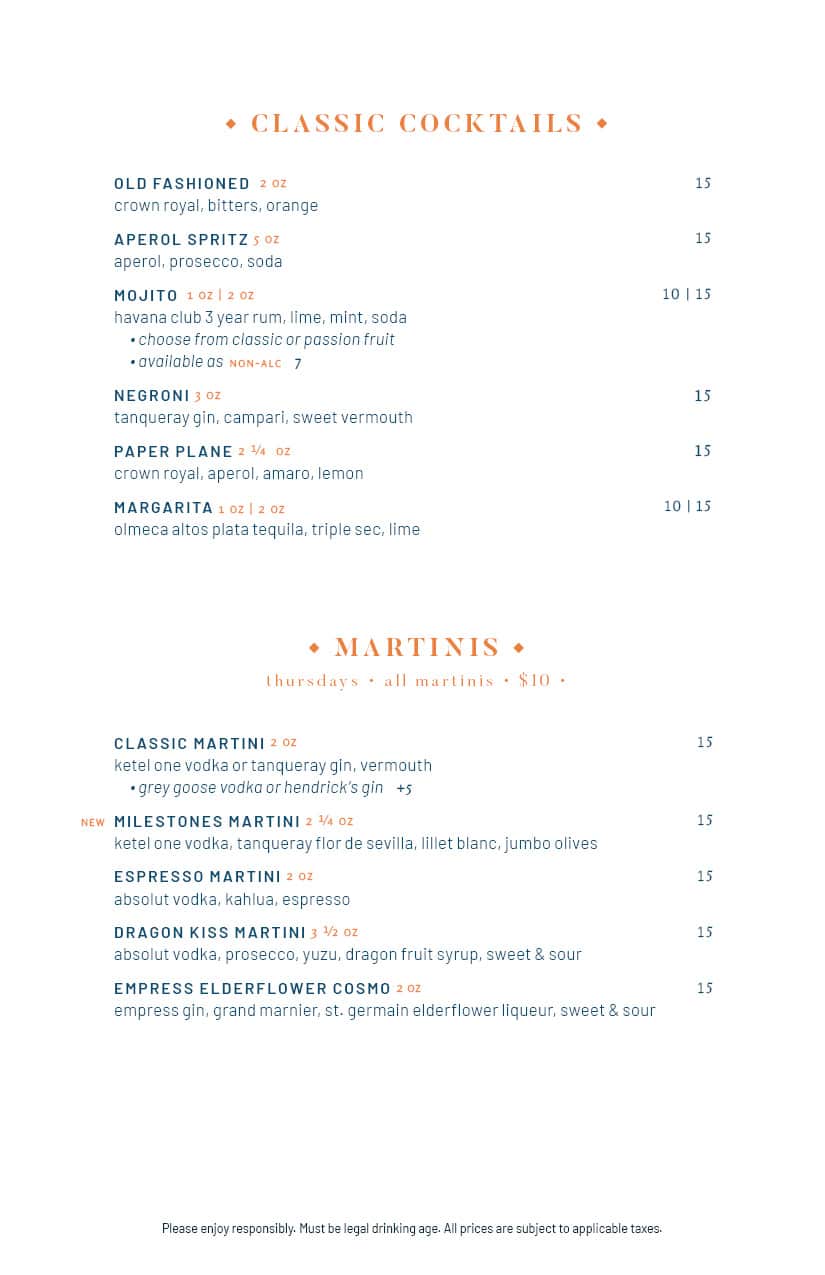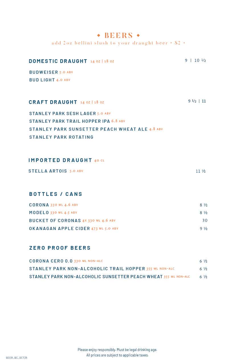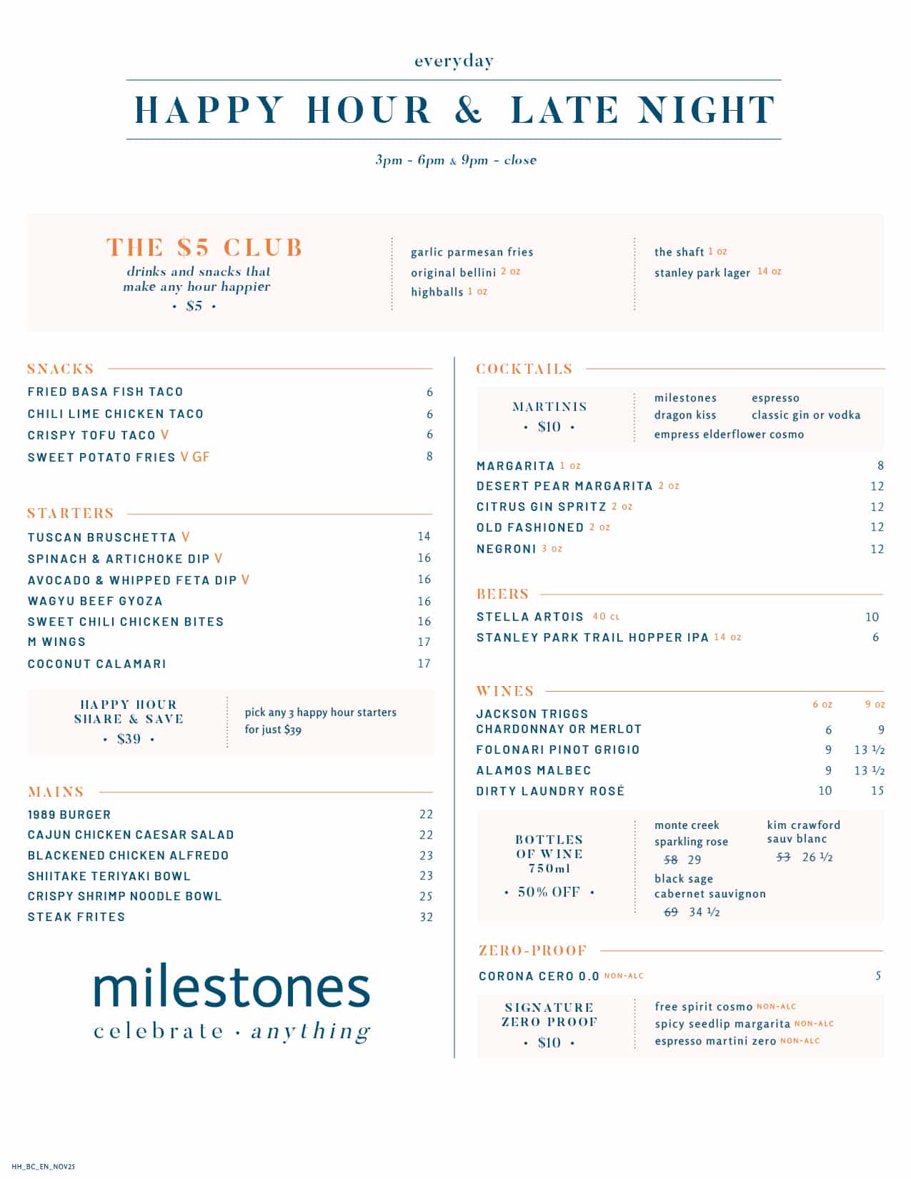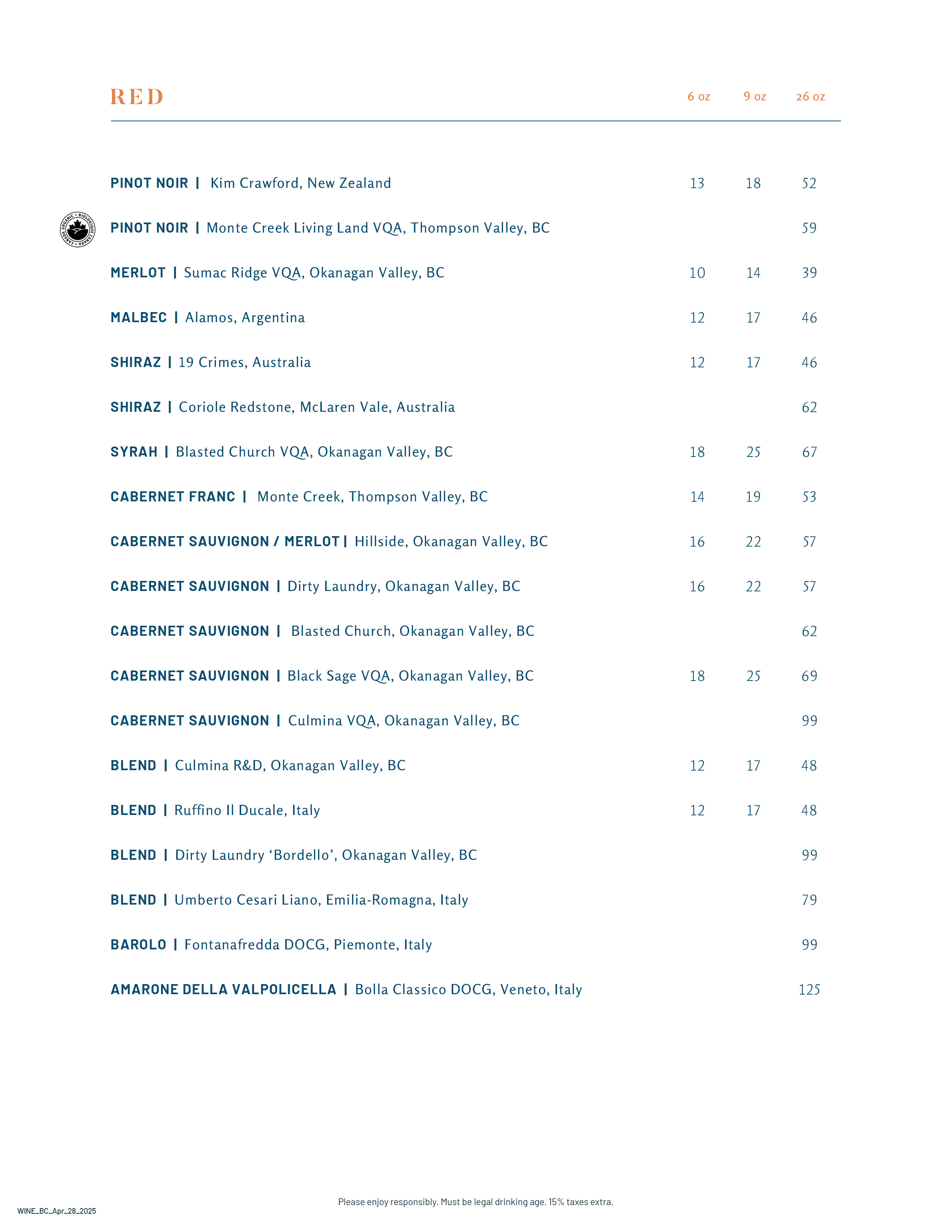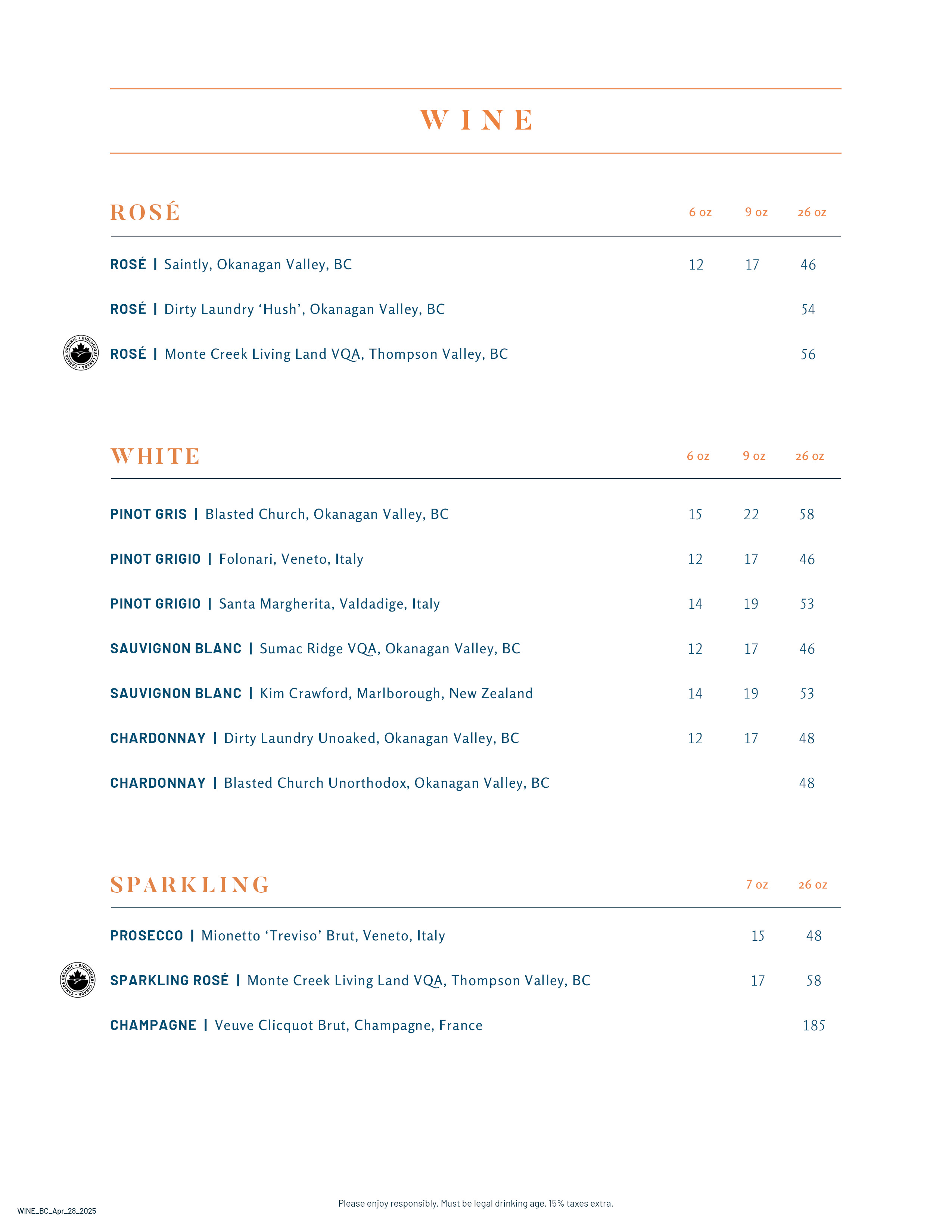 All applicable taxes extra. Gluten Friendly items are made with gluten-free ingredients, however, please be advised that cross contamination with gluten containing products may occur in our kitchen during preparation. Please ask your server for details. Some items may contain nuts and/or allergens. Food Allergy Caution – the safety and satisfaction of our Guests is our highest priority. Although precaution is taken to manage the risk of allergen cross contamination in our kitchen, please be advised that there is a possibility of cross contamination occurring during preparation. Therefore, we cannot guarantee that a menu item is free of peanuts, tree nuts and | or other allergens.