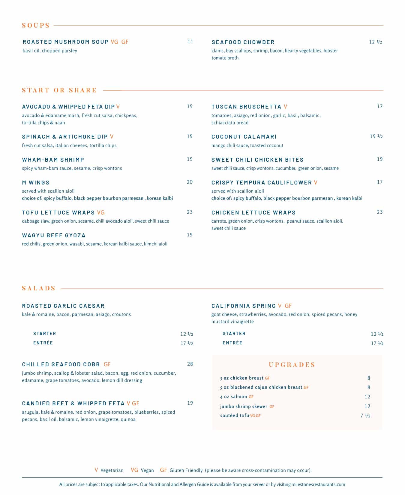 All applicable taxes extra. Gluten Friendly items are made with gluten-free ingredients, however, please be advised that cross contamination with gluten containing products may occur in our kitchen during preparation. Please ask your server for details. Some items may contain nuts and/or allergens. Food Allergy Caution – the safety and satisfaction of our Guests is our highest priority. Although precaution is taken to manage the risk of allergen cross contamination in our kitchen, please be advised that there is a possibility of cross contamination occurring during preparation. Therefore, we cannot guarantee that a menu item is free of peanuts, tree nuts and | or other allergens.