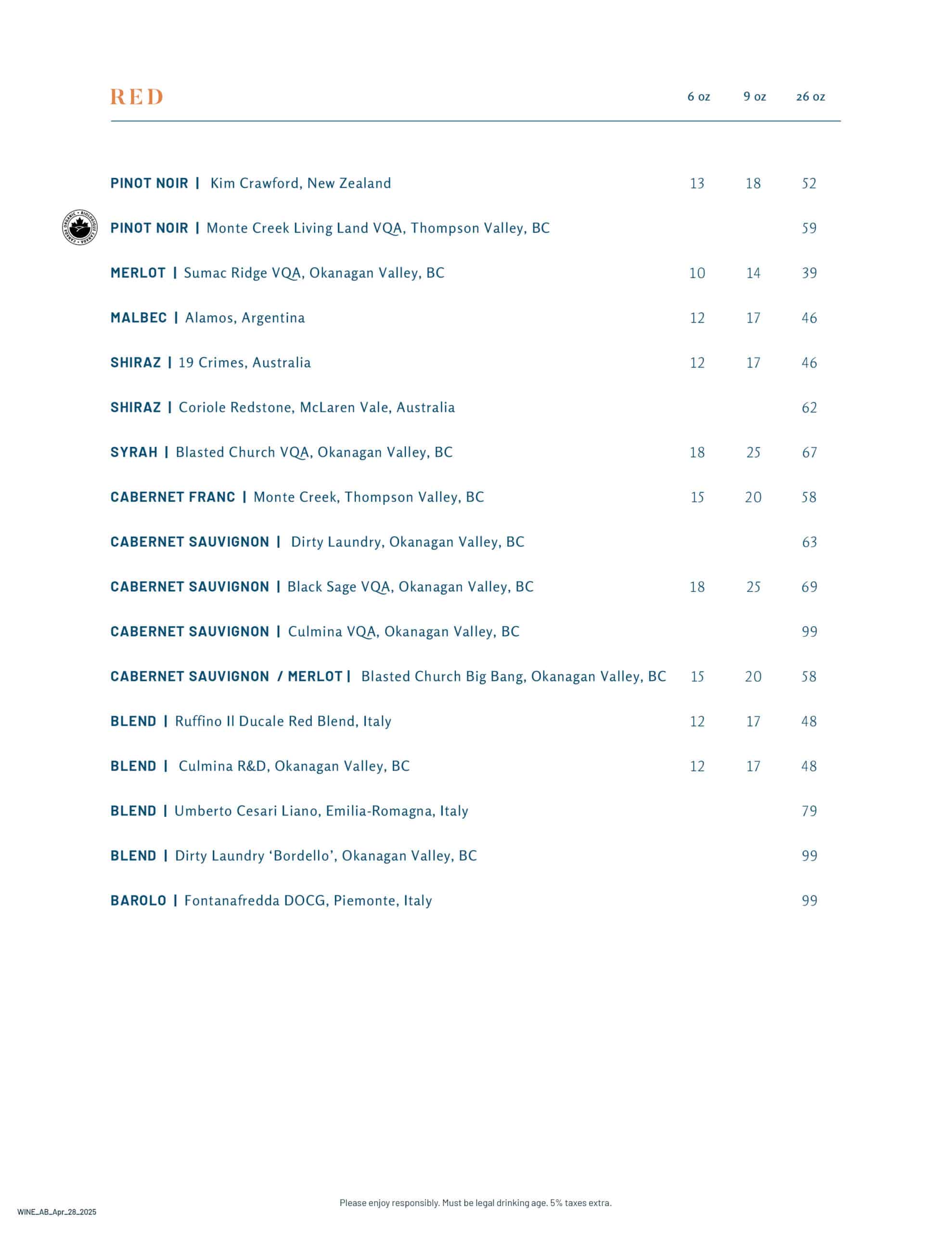 All applicable taxes extra. Gluten Friendly items are made with gluten-free ingredients, however, please be advised that cross contamination with gluten containing products may occur in our kitchen during preparation. Please ask your server for details. Some items may contain nuts and/or allergens. Food Allergy Caution – the safety and satisfaction of our Guests is our highest priority. Although precaution is taken to manage the risk of allergen cross contamination in our kitchen, please be advised that there is a possibility of cross contamination occurring during preparation. Therefore, we cannot guarantee that a menu item is free of peanuts, tree nuts and | or other allergens.