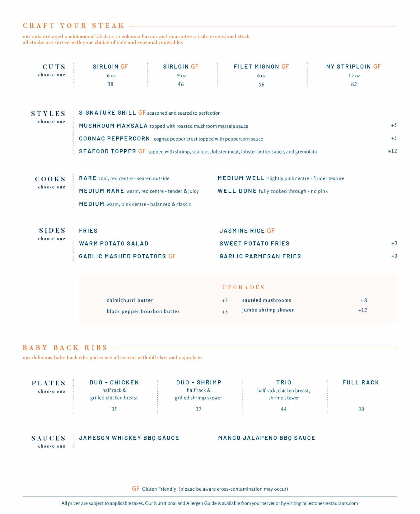 All applicable taxes extra. Gluten Friendly items are made with gluten-free ingredients, however, please be advised that cross contamination with gluten containing products may occur in our kitchen during preparation. Please ask your server for details. Some items may contain nuts and/or allergens. Food Allergy Caution – the safety and satisfaction of our Guests is our highest priority. Although precaution is taken to manage the risk of allergen cross contamination in our kitchen, please be advised that there is a possibility of cross contamination occurring during preparation. Therefore, we cannot guarantee that a menu item is free of peanuts, tree nuts and | or other allergens.